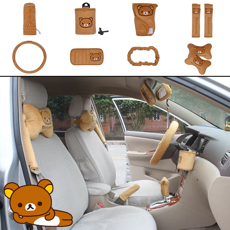 10pcs Unit Auto Accessories Rilakkuma Yellow Car Upholstery Steering Wheel Cover Pillow Bear Car Covers Set Universal Automotive Interior